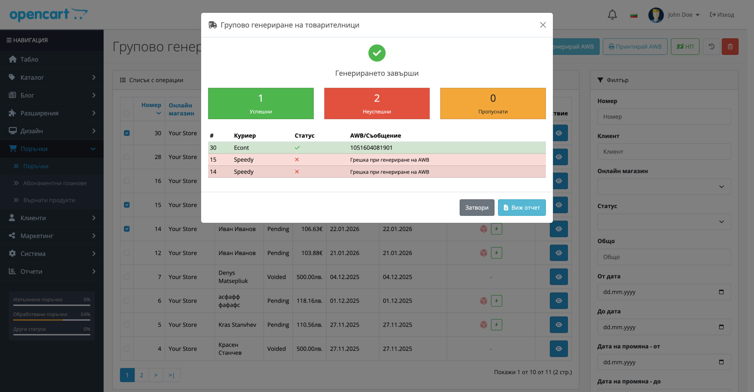 • Успешни — поръчки с генерирана товарителница.