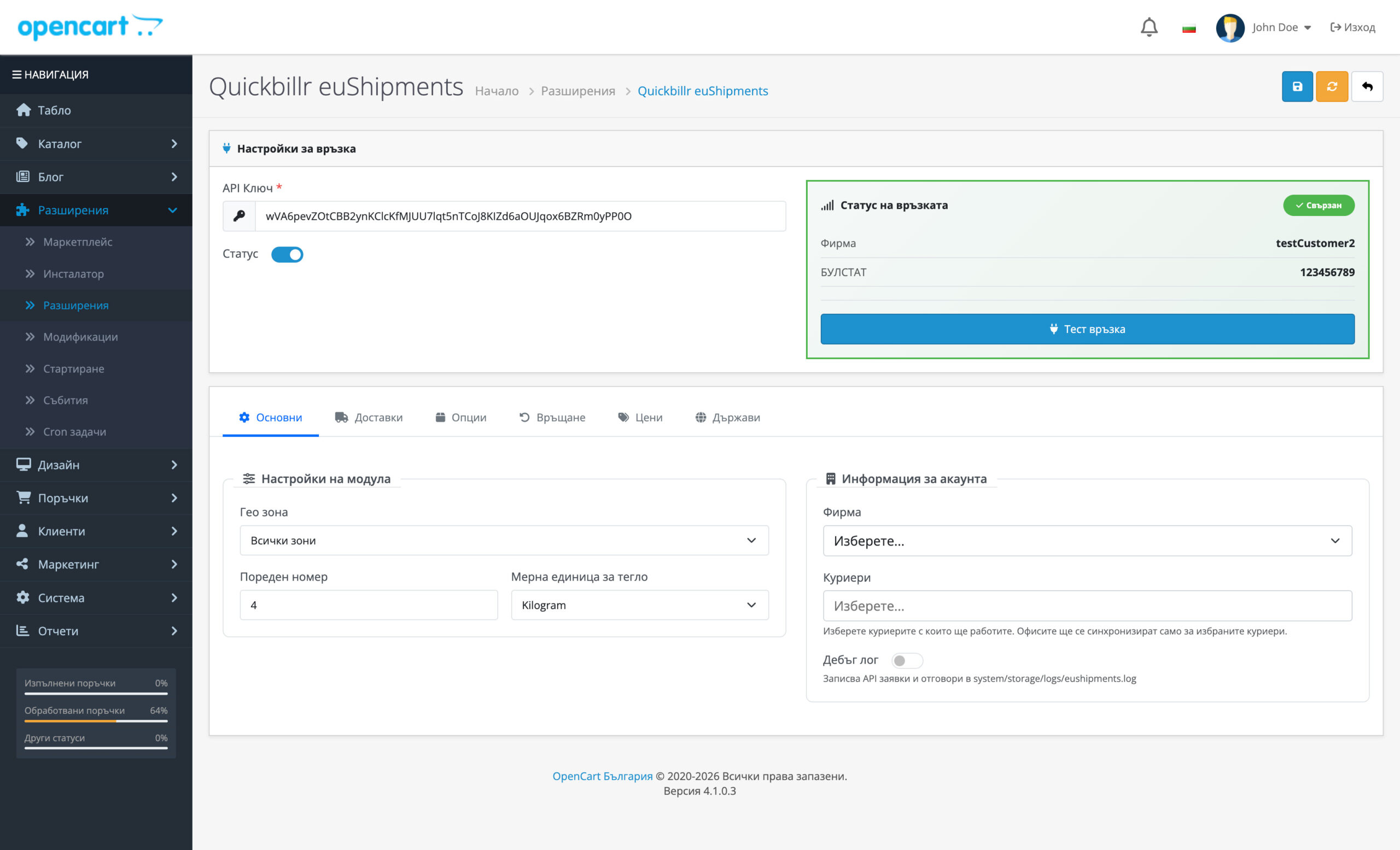 Местоположение: Разширения → Доставка → Quickbillr euShipments
