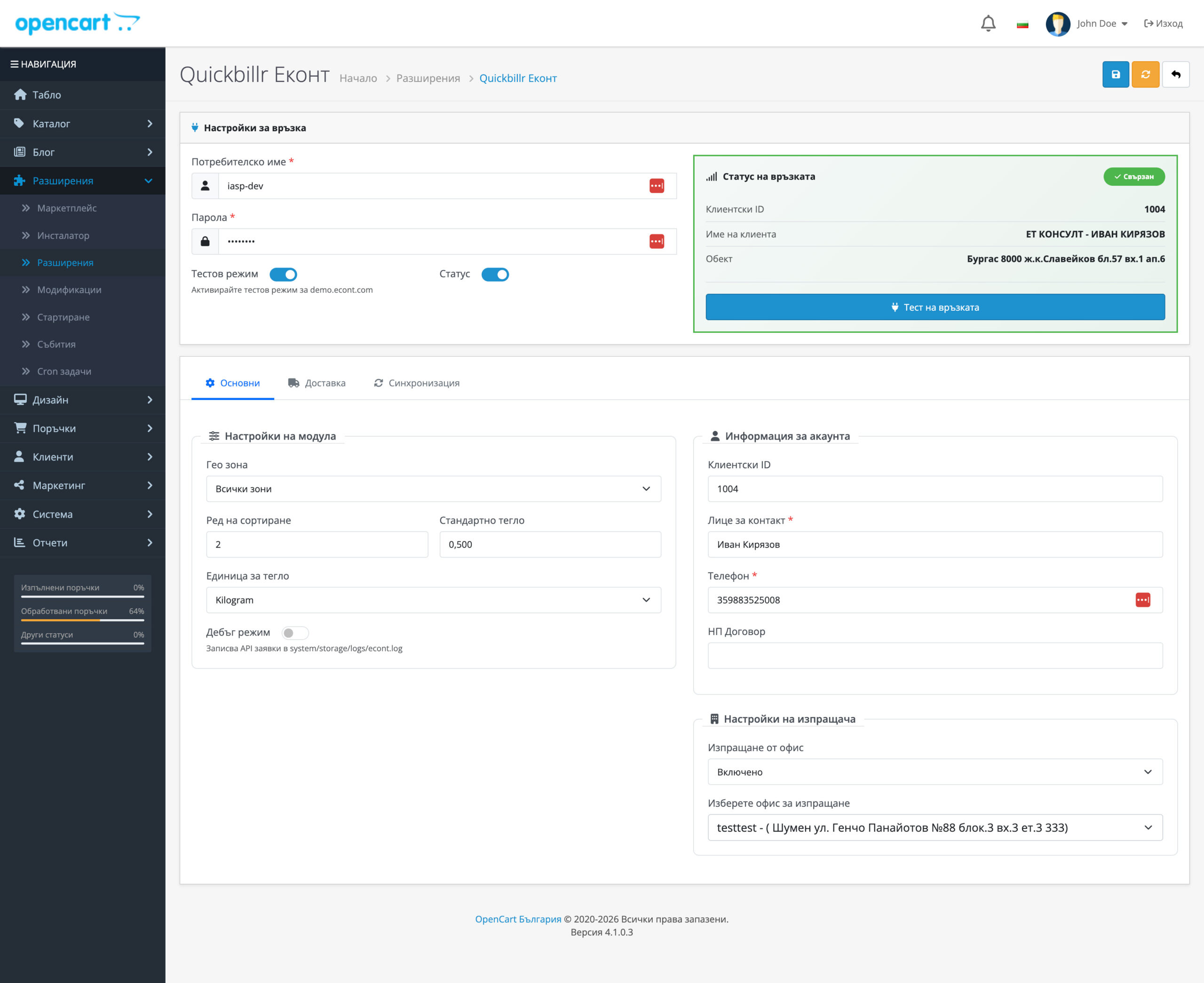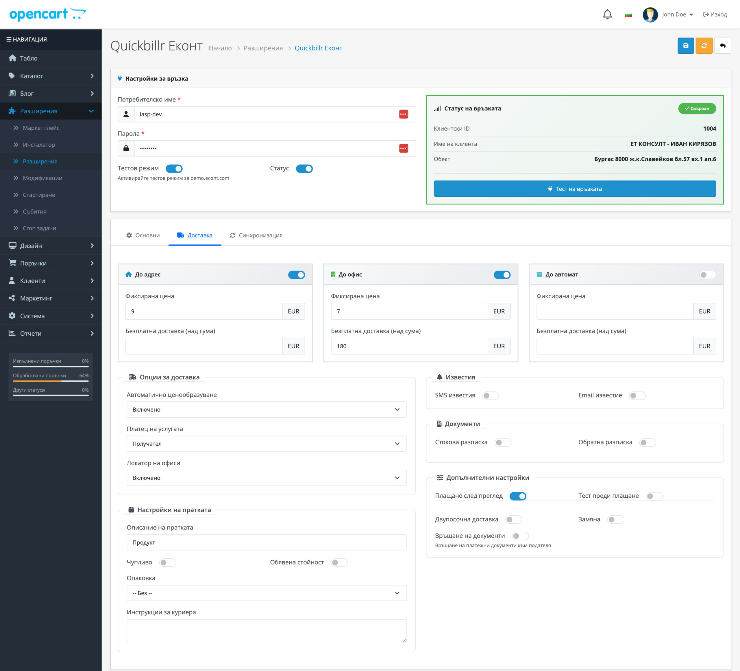 QuickBillr предлага пълна интеграция с куриерската услуга Econt Express, която автоматизира процеса на доставка от вашия OpenCart 4 онлайн магазин. С този модул можете да предложите на клиентите си реални опции за доставка – до адрес, до офис и до пакетомат – с автоматично изчисление на тарифи, избор на услуги и опции директно в checkout страницата.