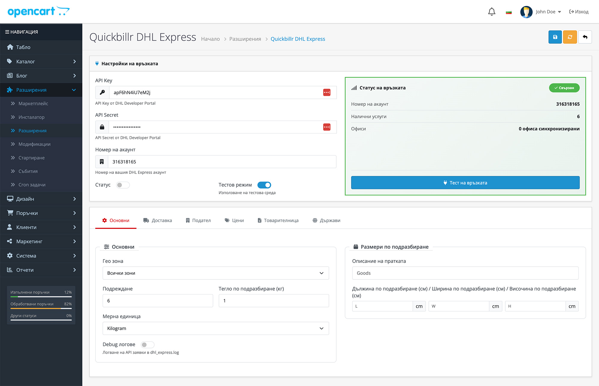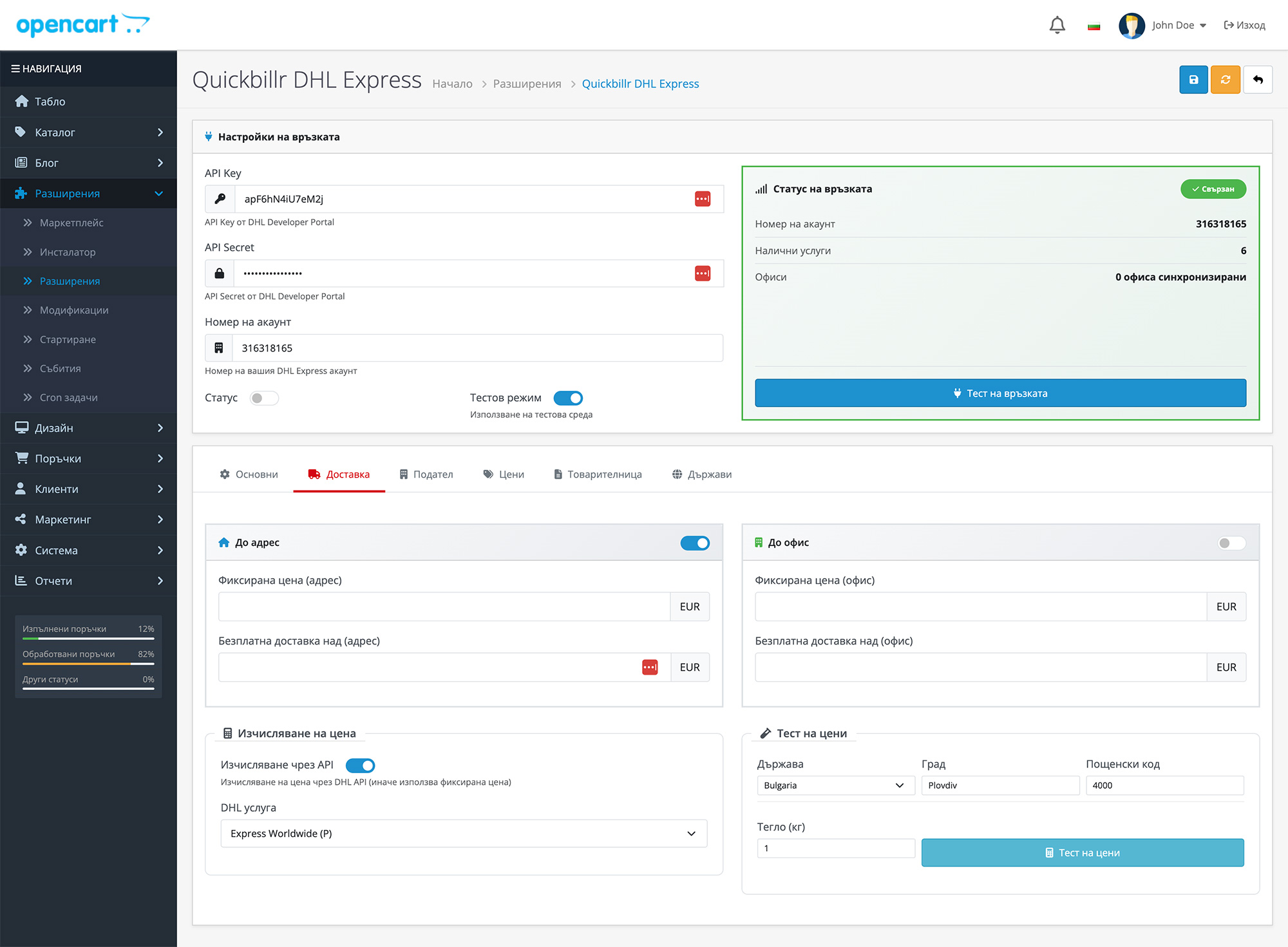 DHL Express интеграцията за OpenCart осигурява директна връзка между твоя онлайн магазин и системата на DHL чрез официалния DHL Express API. Това позволява автоматично изчисляване на цени за международна доставка, генериране на товарителници и проследяване на пратки – директно от OpenCart.