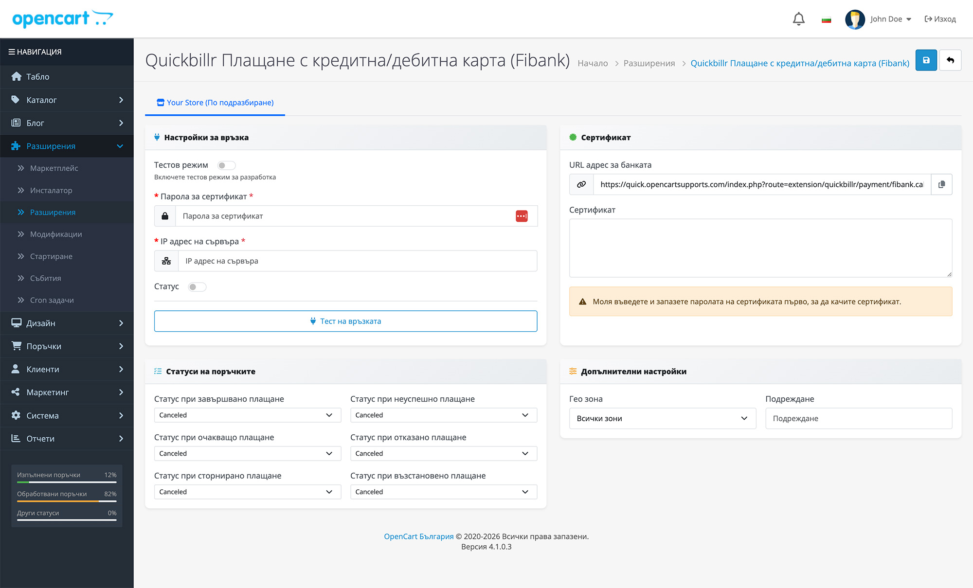 QuickBillr предлага пълна интеграция с Fibank за OpenCart 4, която позволява сигурни онлайн картови плащания чрез платежния gateway на Първа инвестиционна банка (Fibank). Клиентите плащат бързо и сигурно с карти, а поръчките се обработват автоматично.
